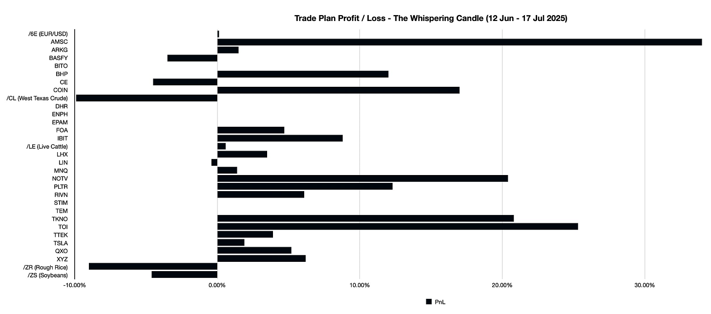 Good evening. I opened this Substack on June 12, 2025, with a price analysis of STIM. Over the ensuing five weeks, I published 29 additional posts, not including this one. While none of my posts are “financial advice”, I suspect some readers placed or held trades, based in part on my analyses. Additionally, I strongly suspect that still many other readers viewed my content but were not so moved. Finally, I know that the vast majority of financially-minded Substackers have not seen any of my writing at all. In order to vindicate the first, encourage the second and invite the third, I thought it prudent to illustrate how well (or poorly) trades based on my analyses are fairing. In this case my sensibilities against ‘tooting’ the horn are outweighed by my desire to grow my paid subscriber base. And here we are.